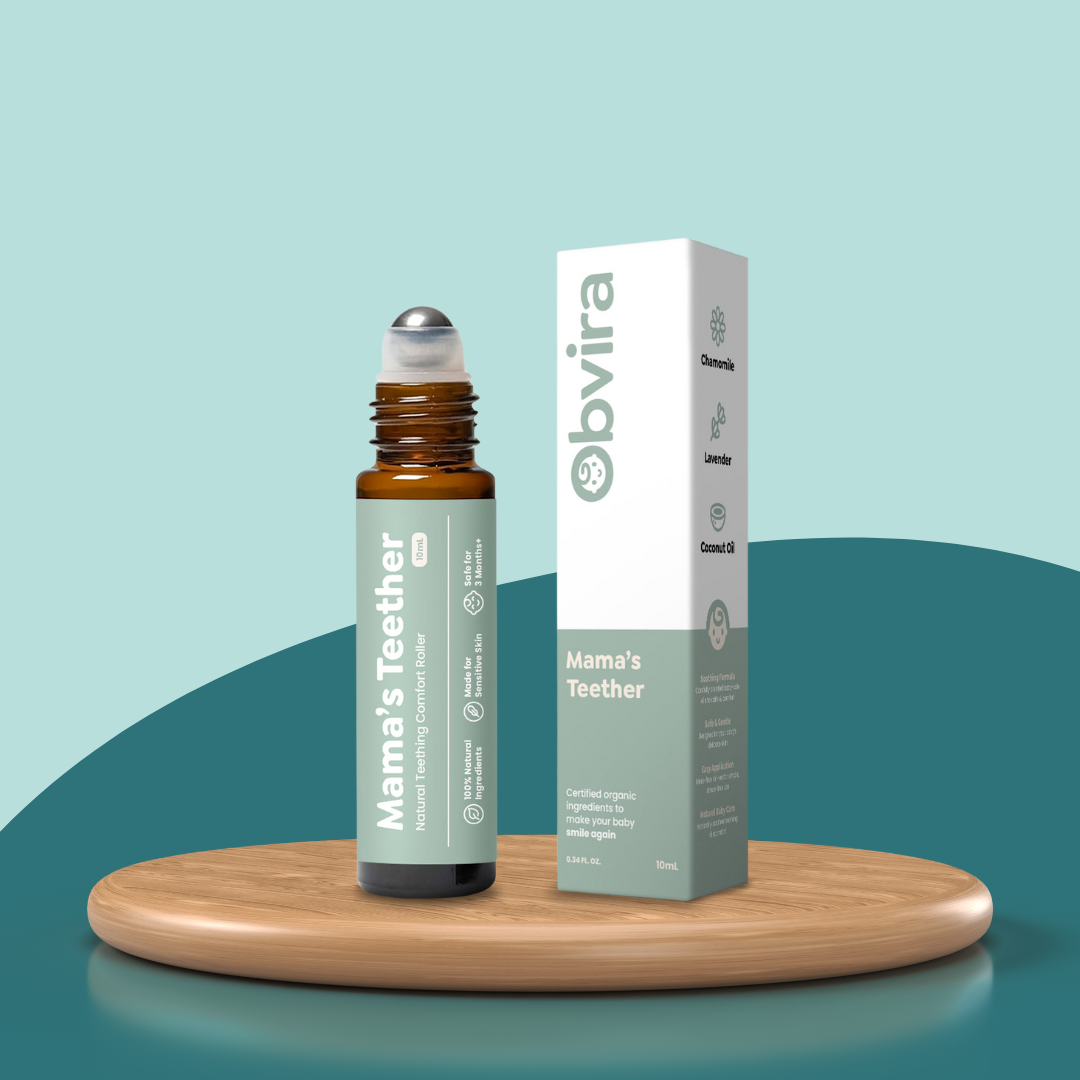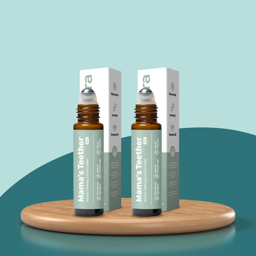 Mama’s Teether™ – pierwszy w 100% naturalny roll-on, który działa zewnętrznie, a dzięki temu jest całkowicie bezpieczny. Rzymski rumianek łagodzi ból i zmniejsza obrzęk dziąseł, lawenda wspiera spokojny sen, a olej jojoba zapewnia szybkie wchłanianie.